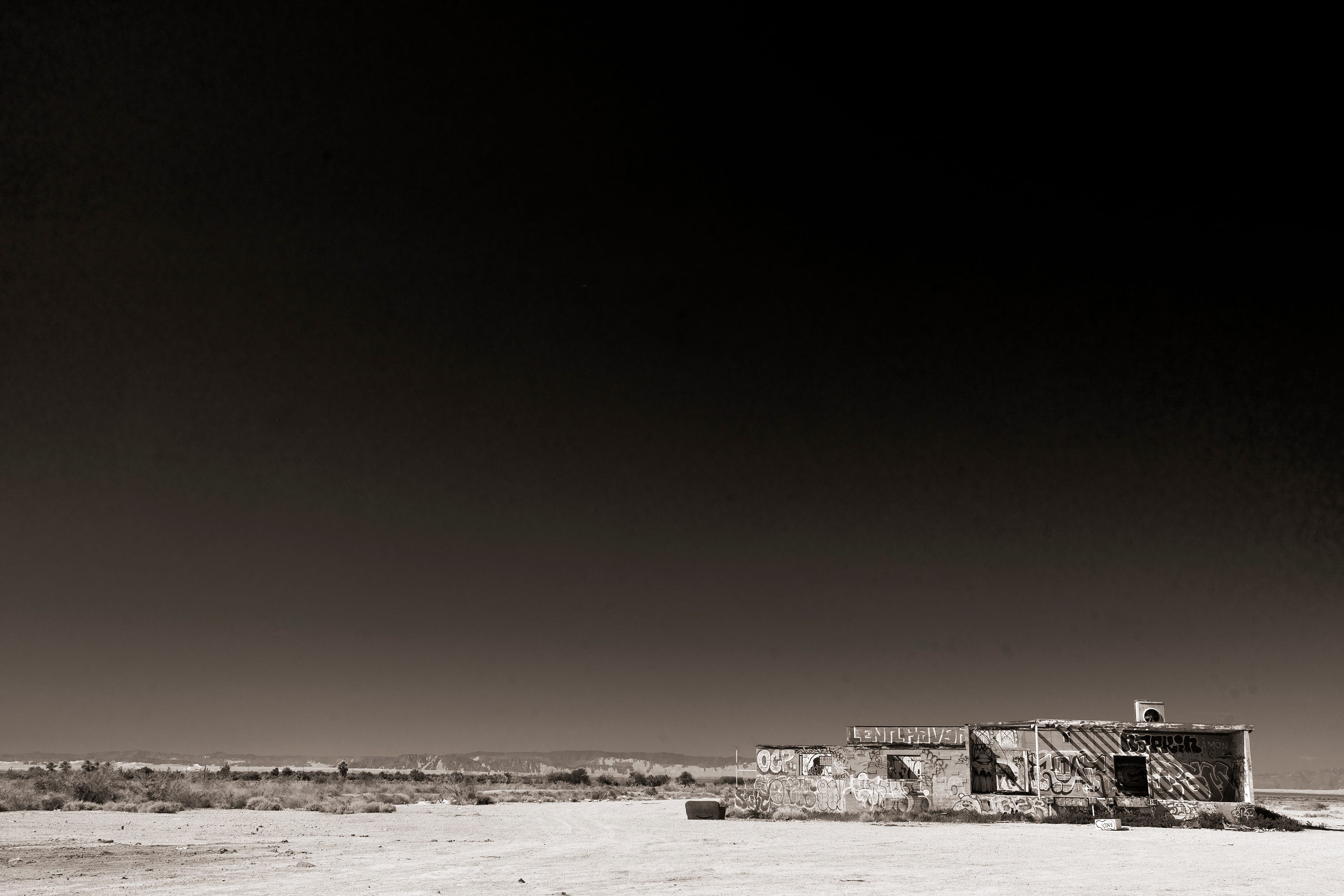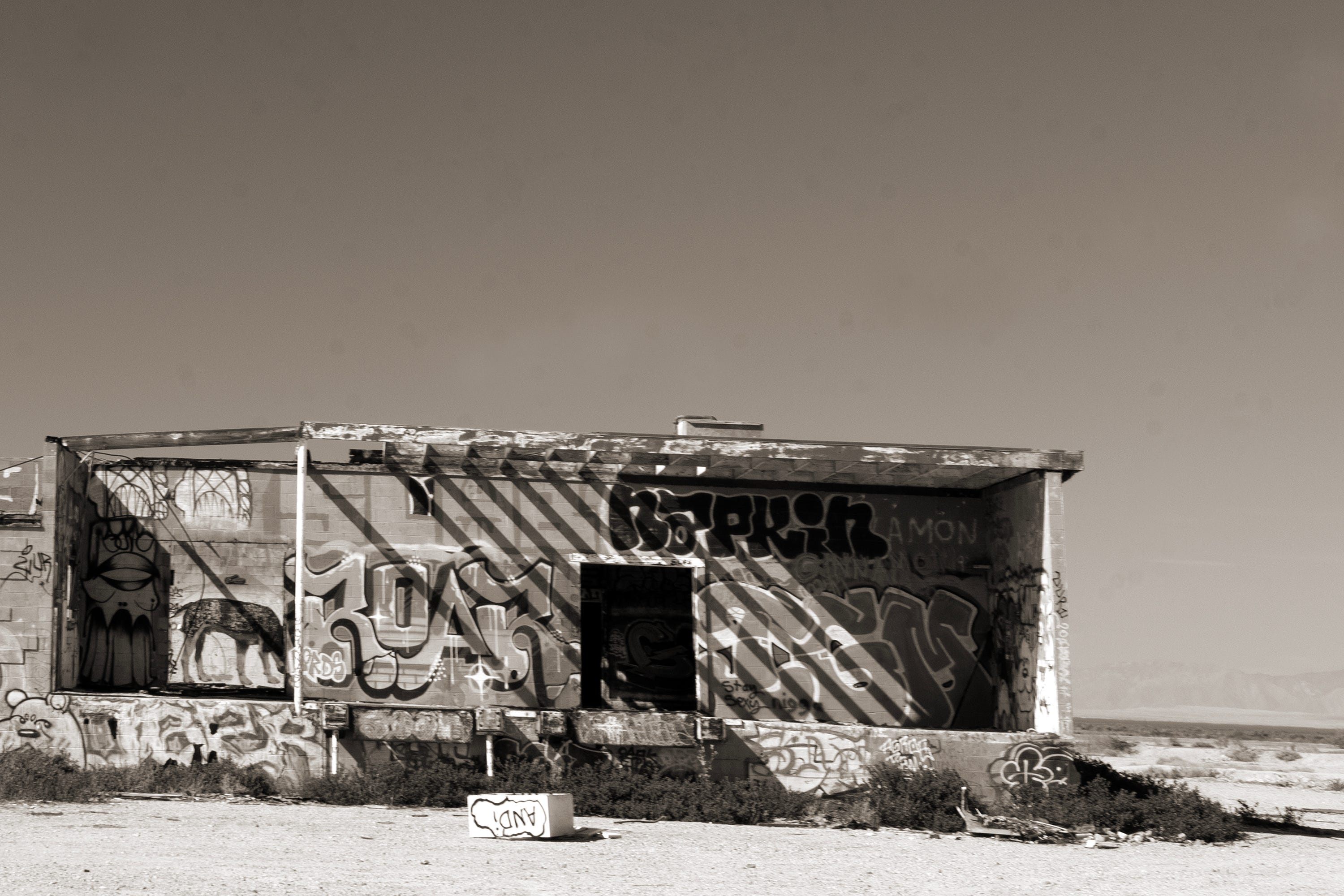 Big, Empty and Weird is the perfect description of Imperial County and the Salton Sea. The first photograph is splendid because it does not show the graffiti but the many shadows on the building at a distance. And as you focus in on the building and graffiti, it is almost like a different place entirely. A great eye dazzler courtesy of your graffiti train!