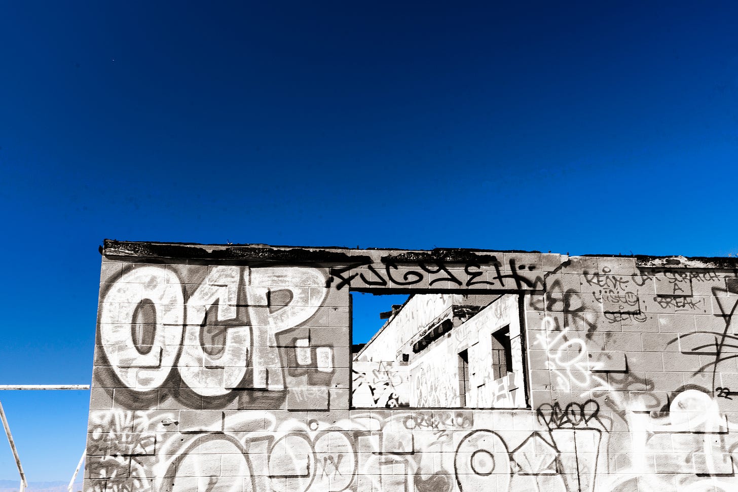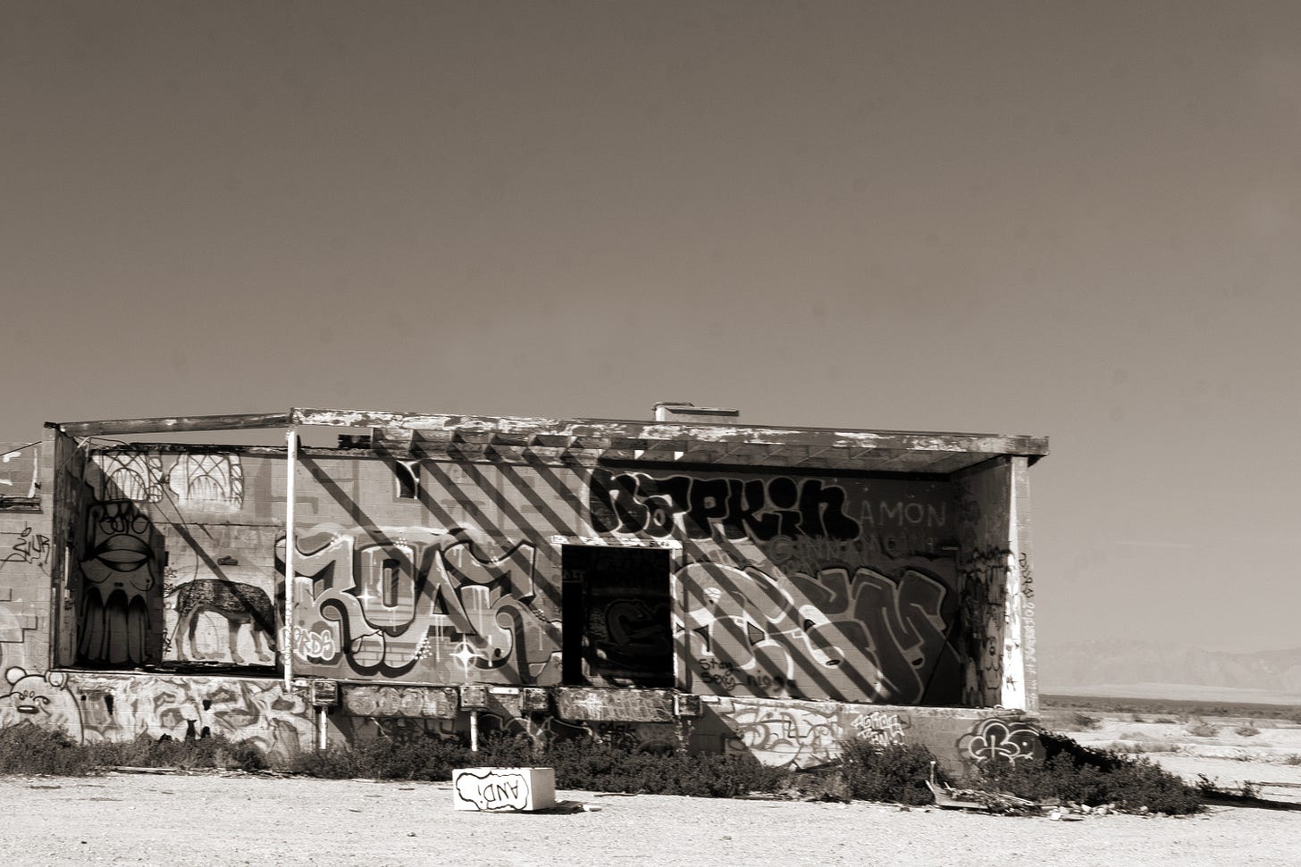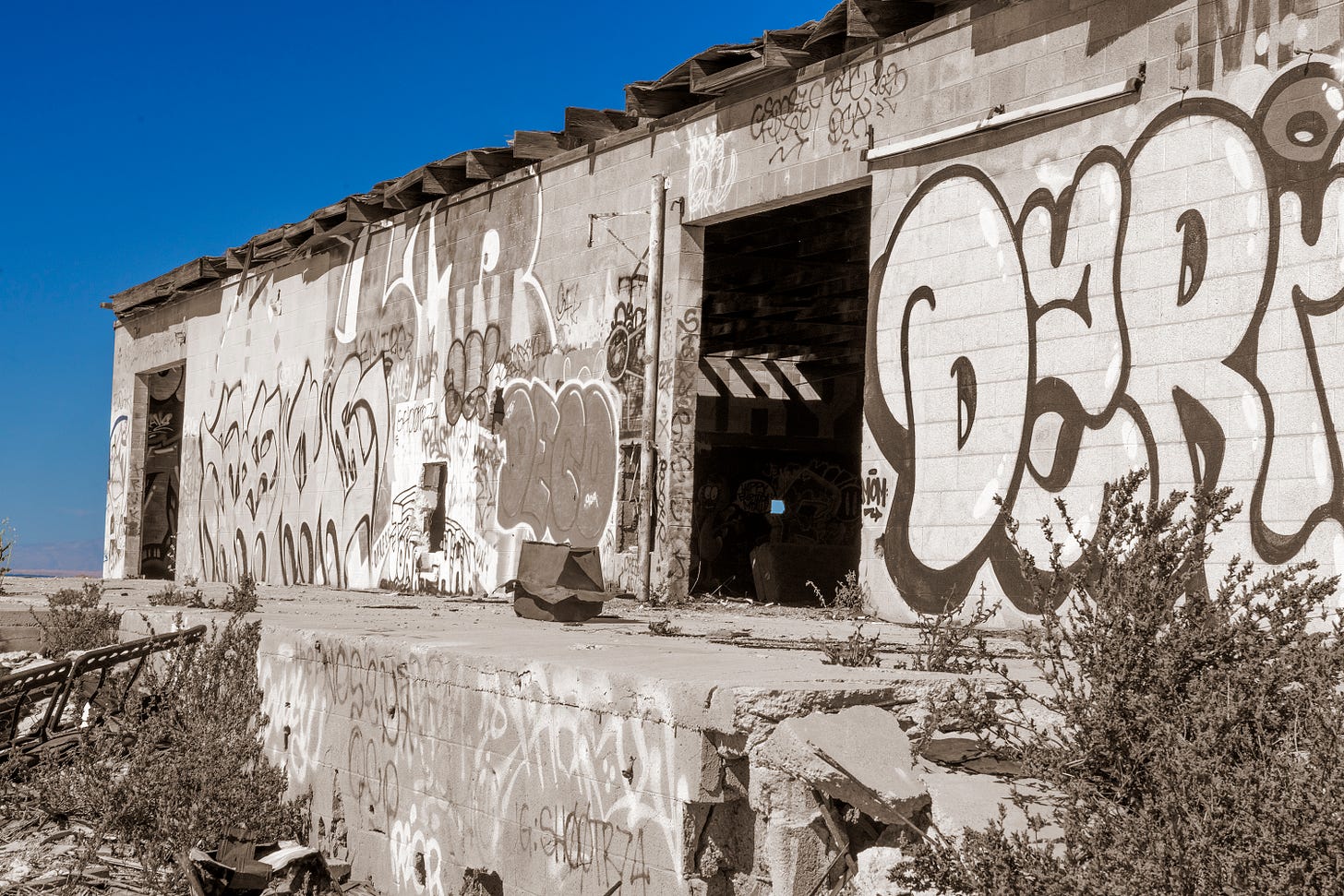 Half a dozen miles north of beautiful Calipatria, the scene of last week’s ode, and on the way to Bombay Beach I saw what appeared to be a distribution facility of some kind. The loading docks and bays conveyed as much. It seemed to have closed years ago since every available surface was tagged, floor to ceiling, inside and out. An installation that elaborate had to have taken decades to complete.